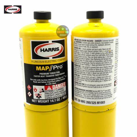 EL Cilindro de Antorcha Manual MAP-PRO contiene combustible premium adecuado para una variedad de Proyectos en el Lugar de trabajo . MAP-PRO funciona mas rapido y de manera mas eficiente con una temperatura de combustion mas alta que el propano Standar . Este Cylindro funciona bien con las antorchas manuales de airs-combustible de HARRIS . El cylindro es delgado y ligero facil agarrar y maniobrar . Precion de funcionamiento : 250 PSI . temperatura de la llama en el air : 3730 F(2054 grado celius)