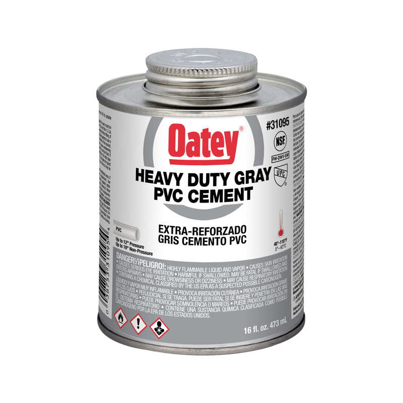 Oatey PVC Heavy Duty Medium Set Gray Cement is recommended for DWV, pressure pipe, potable water and electrical applications. Its thick formula fills gaps in large diameter pipe and fitting joints and is easy to apply with included in-lid dauber. This gray, heavy duty, medium set cement can be used to solvent weld all schedules and classes of PVC pipe and fittings with interference fit up to 18 in. diameter for non-pressure and 12 in. diameter for pressure pipes. Oatey products have earned the trust of plumbing professionals for over 100 years.
